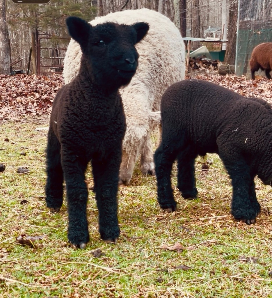 We have a mated pair of babydoll sheep, Abe and Evie. This February, we welcomed their twins, a boy and a girl. They bound around the field, chasing and playing with the chickens, and wagging their little tails while they nurse. Evie is a great mamma. She dotes on them and puts up with their antics as they use her back as a springboard for their hops, practicing coordination.